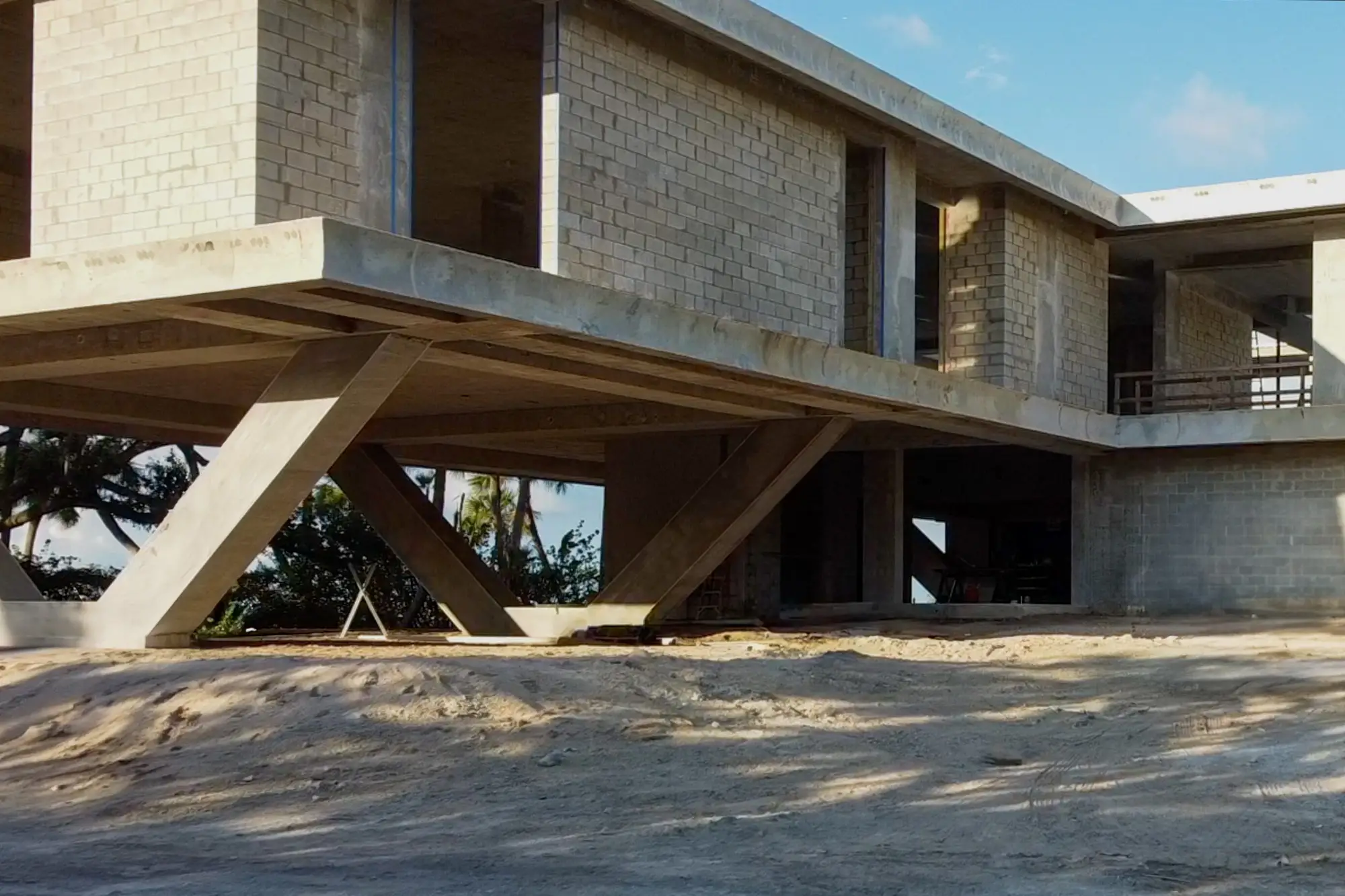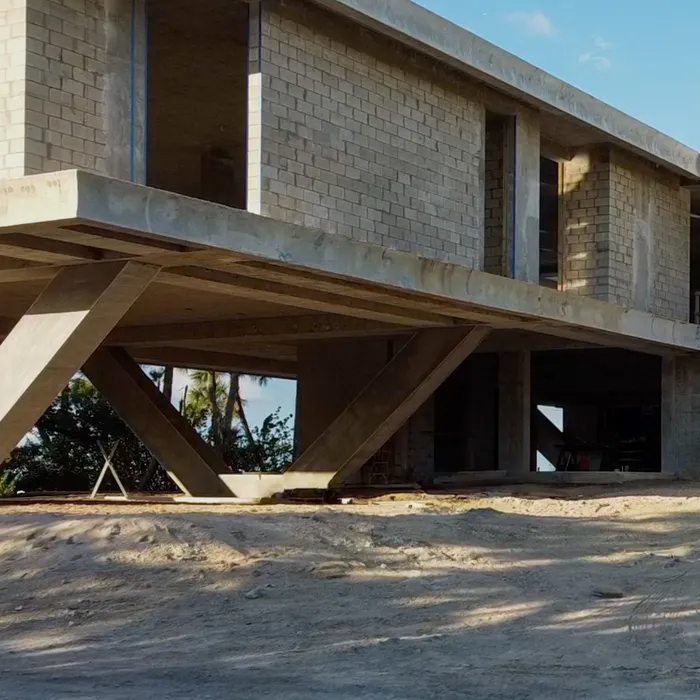 This remarkable estate represents a pinnacle of modern residential construction complexity, requiring specialized post-tensioned concrete systems to achieve the dramatic cantilevers and open floor plans that define the contemporary aesthetic while maintaining structural integrity in the waterfront environment. The aerial construction documentation reveals the massive scale of concrete work and precision engineering required for the multi-level design, including the innovative drive-through garage system and integrated pool construction that creates seamless indoor-outdoor living spaces. The combination of Sewalls Point's coveted waterfront location, substantial acreage, and the technical achievement of over 33,000 square feet of advanced concrete construction creates a residence that exemplifies modern luxury living while showcasing Shellco's expertise in executing the most complex contemporary residential projects in South Florida's premier waterfront communities.